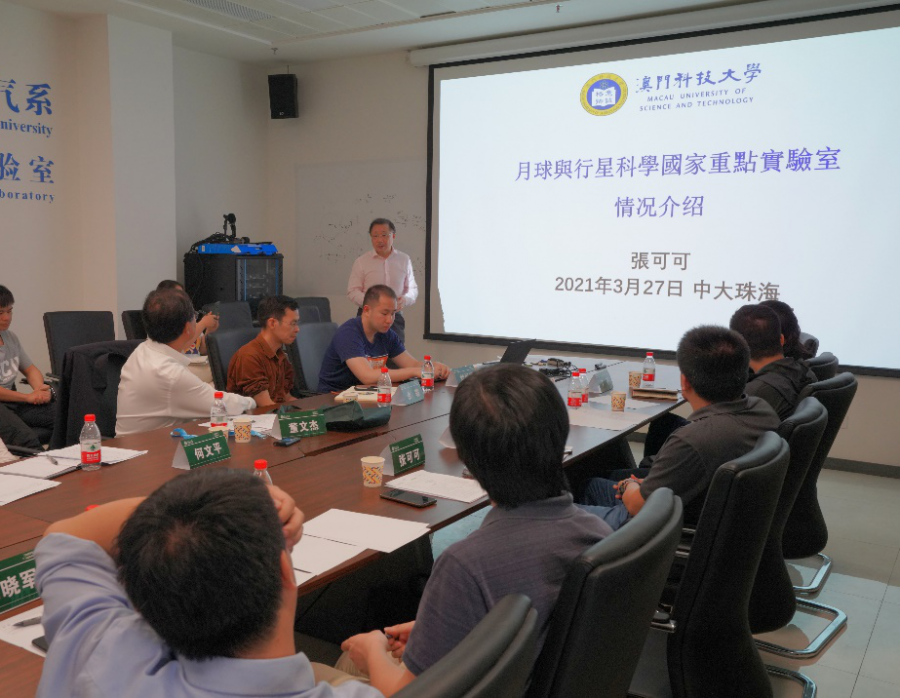 随后,澳方代表介绍了澳门科技大学月球与行星科学国家重点实验室的教学科研情况。张可可教授从“面向深空探测科学前沿”、“面向国家战略需要”、“面向国家重要经济需求”、“面向澳门社会效益”四个方面对月球与行星科学国家重点实验室的情况进行了介绍;倪冬冬副教授、徐晓军助理教授、周剑超助理教授、蔡涛助理教授、丁忞助理教授及邹正洋助理教授介绍了澳门科技大学在行星内部结构研究、太阳风-火星电离层能量交换机制、行星大气/气候模拟、类地行星岩石圈动力学研究、地球辐射带高能电子动态演化等方面的最新研究进展。