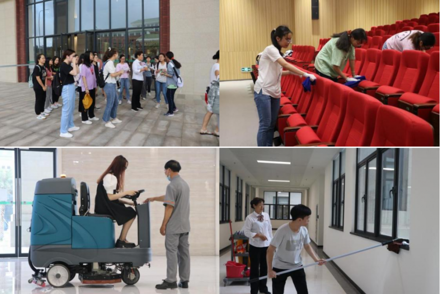 当天上午,20级学生在院楼门口集合后,迅速地组成了四个小分队并落实小队任务,分别负责室外草坪、楼内报告厅、楼梯以及地面的清洁工作。同学们在保洁人员的带领下前往本队任务区域,在观看保洁人员的亲身示范后,迅速地投入了自己的工作。