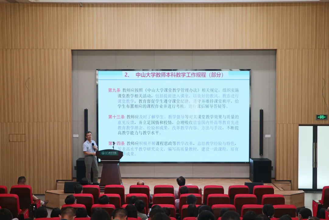 全国气象教学名师、党委纪检委员、气象系主任简茂球教授作师德师风专题报告。简茂球教授对《新时代高校教师职业行为十项准则》、《中山大学教师本科教学工作规程(2021)》两个文件进行了阐释,他提醒老师坚守师德底线,避免教学差错和教学事故,并鼓励青年老师把“教学”这一篇发表不了且需要不断修改的论文写好,努力成为一个有理想信念、有道德情操、有扎实学识、有仁爱之心的“四有”好老师。