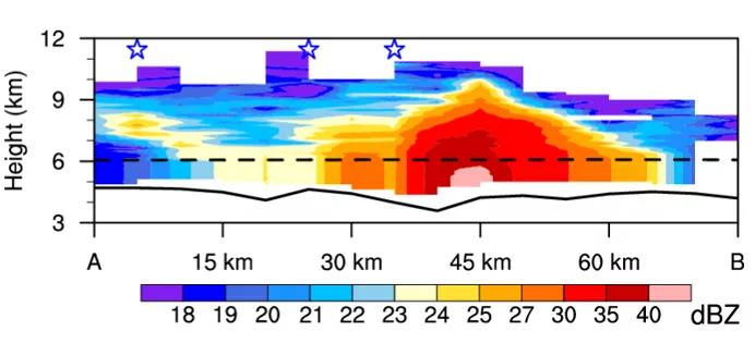 在这项研究工作中,研究人员发现“幻影回波”的回波最大值出现在了0度层以上1.5 km,且在0度层附近没有出现亮带(图1)。这一结构提升了降水发展高度、抑制了降水粒子下传,但可能促进了邻近区域降水的发展。