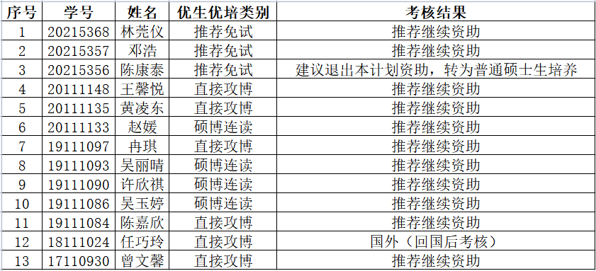 我院对“优生优培”研究生进行了2021学年考核,经被考核人个人汇报、考核专家提问等环节,考核结果如下:
