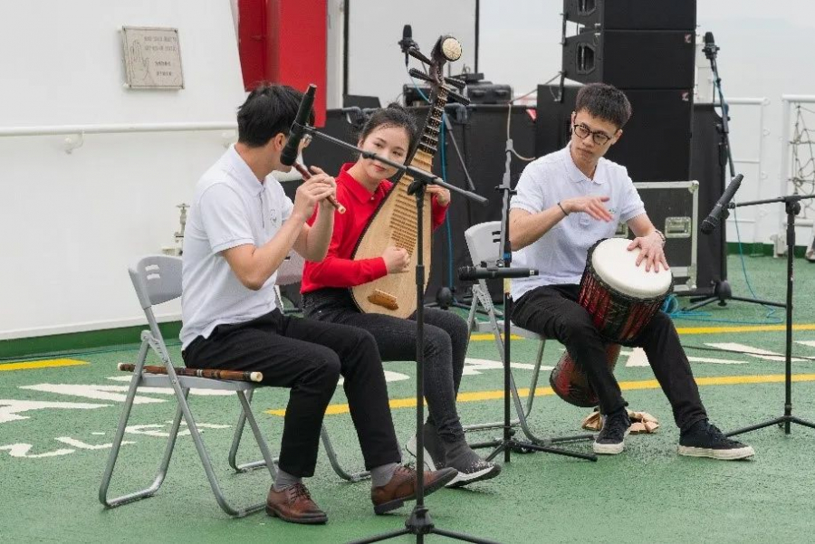 而后,参会人员在“中山大学”号科考船上举行了交流联谊活动。国防科技大学朱小谦院长、太阳成集团tyc9728杨崧教授、中山大学艺术学院金婷婷院长和各位教师代表、“中山大学”号科考船蓝明华、金德飞船长和船员合唱团为大家带来了歌舞、合唱、民乐合奏等节目,在轻松的气氛中,增进彼此的认识。