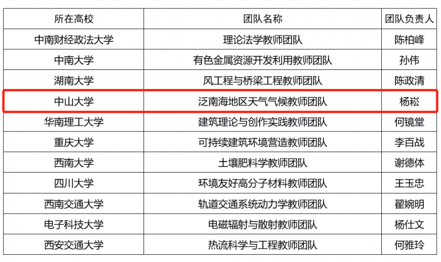 日前,教育部公布第二批全国高校黄大年式教师团队,我院杨崧教授负责的泛南海地区天气气候教师团队成功入选。这是中山大学继2018年肖海鹏教授负责的附属第一医院临床医学教师团队获得全国首批高校黄大年式教师团队荣誉称号后,第二次获此殊荣。
