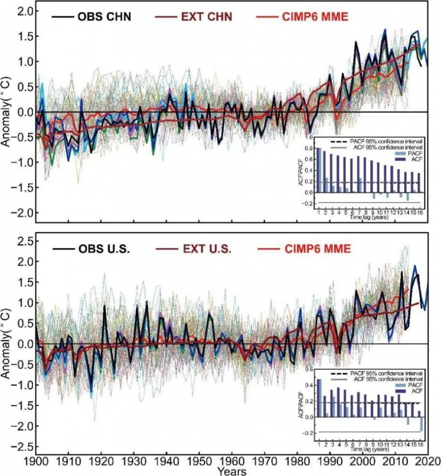 近年来,一些研究人员倾向于将这种显著性差异归因于中国区域更高的温室气体排放或者是快速的城市化进程,但显然这种解释还缺乏非常有力的观测和模拟证据。根据IPCC最新的耦合模式历史集合模拟输出(CMIP6),美国区域的平均气温对于外部强迫(主要是温室气体和气溶胶)响应,要明显强于中国区域平均气温的响应,而这和观测结论正好相反。