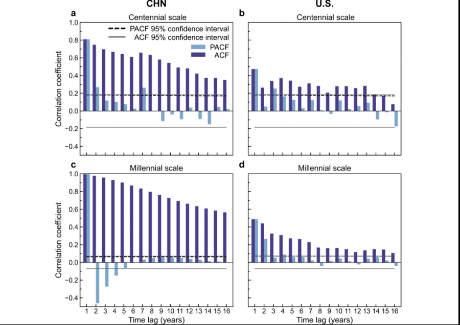 文章进一步分析表明,这种区域性增暖的不均衡性可以用区域平均气温对外强迫响应的长程持续性(Persistence)(或“记忆”(Memory))来较好地解释。气候变化的长程持续性(Long-term Persistence)(或“记忆”)包含了海气耦合作用的影响,并在年代际和世纪尺度上得以强化,成为了当前气候变化研究的一个关键问题。作者们通过对比2000年以来(这一段时期的气候变化特征较为平稳)古气候代用重建资料和100多年来的现代气候基准观测数据,发现无论在千年尺度上,还是在百年尺度上,中国区域平均温度的“记忆”都显著强于美国(图2),即它贡献了更多的外强迫导致的增暖趋势(而CMIP6模式则再次低估了这种持续性差异)。