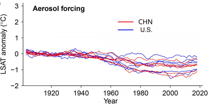 图3 采用经典方法得到的气溶胶强迫因子对中美两国气温变化的贡献
