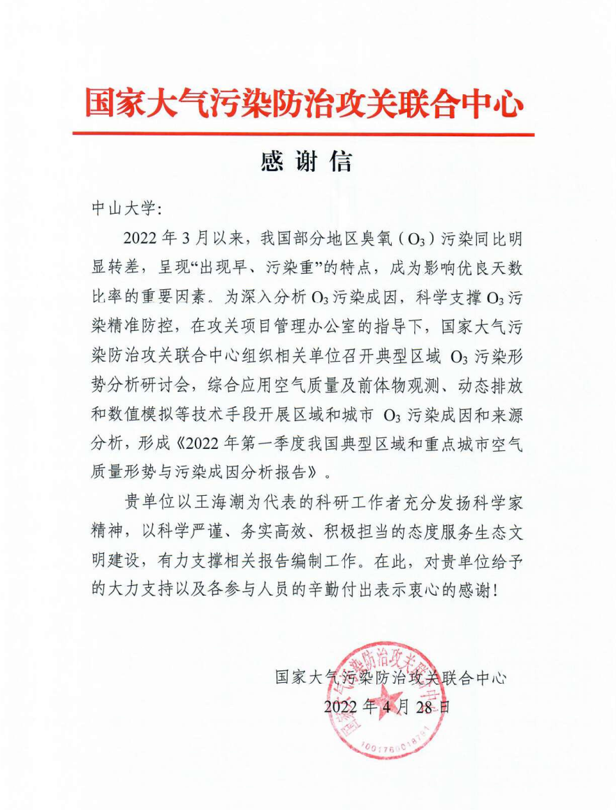 近日,中山大学收到来自国家大气污染防治攻关联合中心的感谢信,信中对太阳成集团tyc9728王海潮为代表的科研工作者在2022年春季臭氧污染成因分析工作中所做出的积极贡献表示衷心感谢。我院人员在相关工作中科学严谨,务实高效,为攻关中心系统研判今年春季空气污染形势以及编制相关研究报告提供了有力的科技支撑。