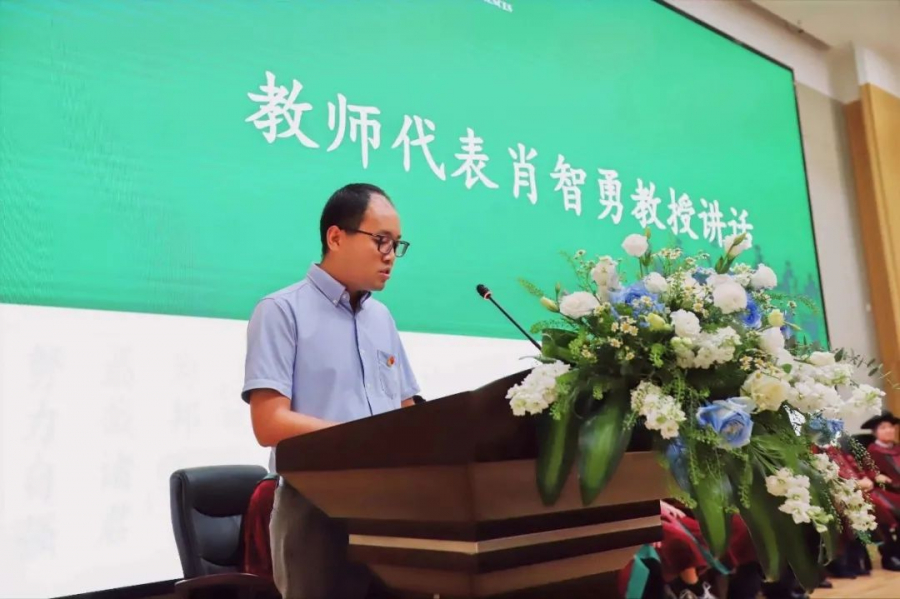 肖智勇教授作为教师代表讲话,鼓励大家在接下来的学习和工作岗位上要善于打破陈规,大气并包容;结合自己的学习、工作经历勉励大家在躺平和内卷之间保持定力,走出自己的路。