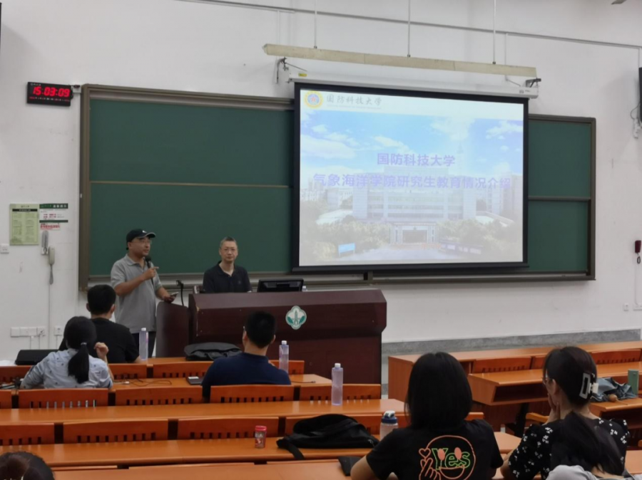会上,国防科大的专家们向同学们介绍了国防科技大学气象海洋学院的概况及招生策略,80余名学生参会。会议由学院副院长杭建教授主持。