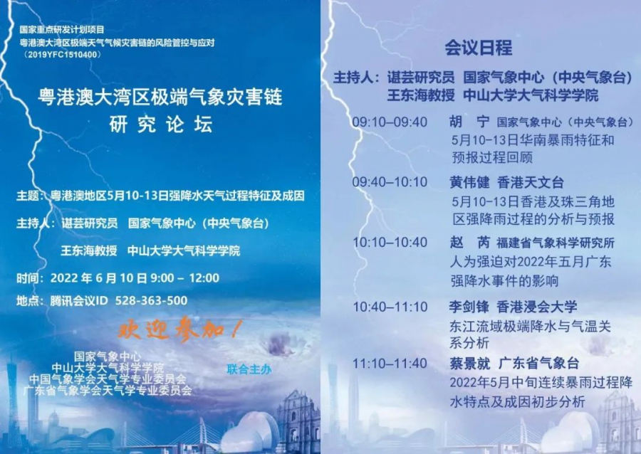 2022年6月10日上午,我院联合国家气象中心、中国气象学会天气学专业委员会、广东省气象学会天气学专业委员会顺利举办了“粤港澳大湾区极端气象灾害链研究”论坛之“粤港澳地区5月10-13日强降水天气过程特征及成因”专题研讨会。会议由国家重点研发计划“粤港澳大湾区极端天气气候灾害链的风险管控与应对”项目首席科学家王东海教授与国家气象中心谌芸研究员共同主持,来自高校、科研院所及业务部门的两百多人线上参加了此次研讨会。