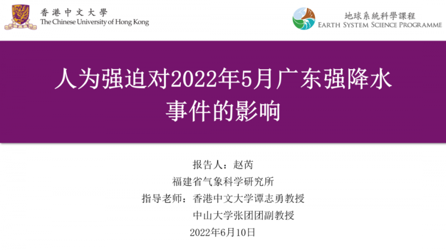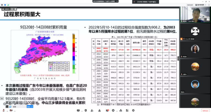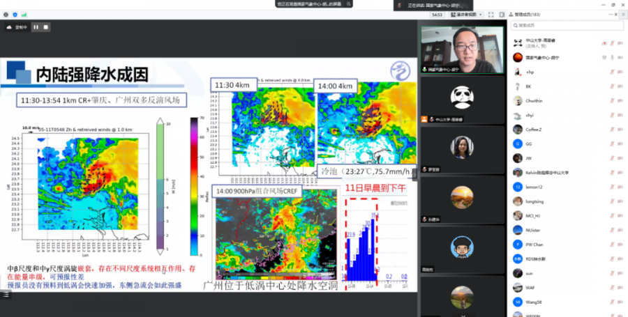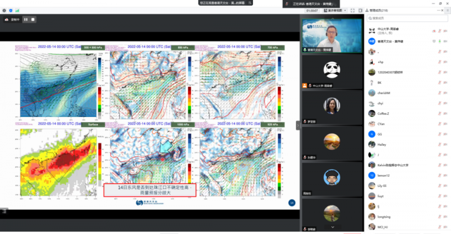 福建省气象科学研究所赵芮博士作了题为“人为强迫对2022年五月广东强降水事件的影响”的报告,通过不同的实验设计和PGW方法,运用高精度区域模式发现人为强迫可以加强广东地区的西南气流,从而使得此次降水中心的雨强和强降水频率有明显增强。香港浸会大学李剑锋教授作了题为“东江流域极端降水与气温关系分析”的报告,运用WRF模式采用敏感性实验,通过调整温度场,发现强降水随着气温的增强存在着先上升后下降的现象,其拐点在24-25℃。广东省气象台蔡景就高工作了题为“2022年5月中旬连续暴雨过程降水特点及成因初步分析”的报告,介绍了此次暴雨的整体过程和天气背景,通过进一步的诊断分析发现,不同暴雨中心及不同区域的低空急流和超低空急流对强降水的影响明显不同。报告期间与会人员踊跃提问,就粤港澳地区5月10-13日强降水天气过程的机理及预报问题开展了热烈的讨论和交流。
