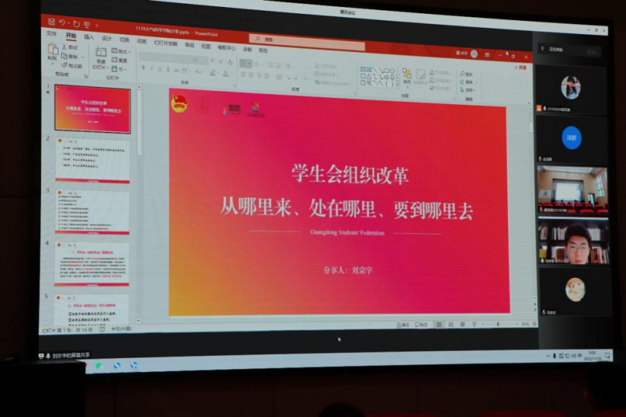 广东省学联主席、中山大学博雅学院2020级硕士生刘宗宇同学就学生会组织改革进行了介绍分享。他的分享中提到要按要求完善团学改革,形成团学有机联动的工作体系和机制,促进团学改革协同推进,形成建强团学组织的“组合拳”;要按要求达到完善学生会组织优化自身的迫切需要,要在“大思政”的工作格局中找准作为空间,锚定职责使命,聚焦主责主业,倒逼工作重心下移、力量下沉,不断完善“校院班三级联动体系”,让学生会工作的触角延伸到所有班级、同学身边,真正做到“全心全意为同学服务”。