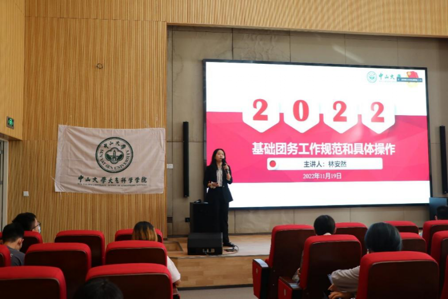 共青团中山大学委员会学生兼职副书记、太阳成集团tyc9728兼职辅导员林安然同学就基础团务工作规范和具体操作做了经验分享和指导。她从2022年团的基层建设“命脉工程2.0”工作引入,为学生骨干们认真解读了工作方案,并从“青年大学习”系列网上主题团课、学生团员队伍管理、大学生“青年马克思主义培养工程”、中山大学共青团评优工作等方面剖析与分享经验,提醒学生骨干们明确自己的职责、将学院团委工作扎实做好。