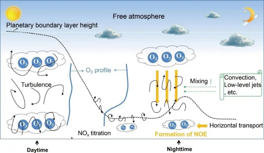 第二项研究关注我国近地面臭氧在夜间反向增加(Nocturnal Ozone Enhancement, NOE)的现象。地面臭氧在日间受光化学过程影响升高,在夜间受到氮氧化物滴定及沉降的共同作用而降低的现象是全球绝大多数城市地区臭氧变化的典型特征。然而,本研究基于6年(2014-2019)的站点组网观测数据发现,中国814个站点在夜间发生NOE事件(定义为臭氧在夜间时段一小时内增加至少5ppbv)的年平均频率为41±10%,比欧洲和美国的站点高出46%,这一现象还从未被报道。结合中美欧三个地区NOE事件发生频率的时空分布特征、NOE事件发生时氮氧化物、一氧化碳和气象条件的统计学特征、及对北京和广州3个典型NOE事件的深入分析,本研究提出了我国NOE事件的概念模型,即白天边界层内大量臭氧化学生成为夜间残留层提供了相较于欧美地区更丰富的臭氧源,而夜间对流活动或低空急流等天气过程通过增强大气不稳定度及湍流混合将残留层中的富臭氧空气混合到地面,造成NOE事件的发生。本研究首次基于全国性的长期观测归纳了我国NOE事件的特征和机理,为我国臭氧演变规律提供了新的认识,对制定臭氧治理策略具有重要意义。论文在线发表后,我院南海及周边地区大气环境研究团队应邀与中国环境科学研究院大气环境研究所就我国夜间臭氧演变问题展开专题研讨。