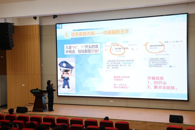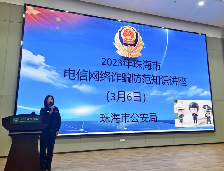 高萍警官从珠海市实际案例出发,通过数个防范电信网络诈骗宣传片,结合高校学生特点详细分析当前电信网络诈骗高发态势、常见诈骗手段及防范诈骗的注意事项,强调面对电信网络诈骗绝不可麻痹大意,要做到慧眼识骗。