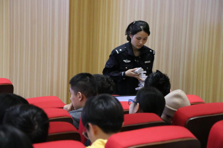 讲座中警官们向同学发放了反诈宣传资料,希望以此警示同学们重视诈骗的危害,提高警惕。