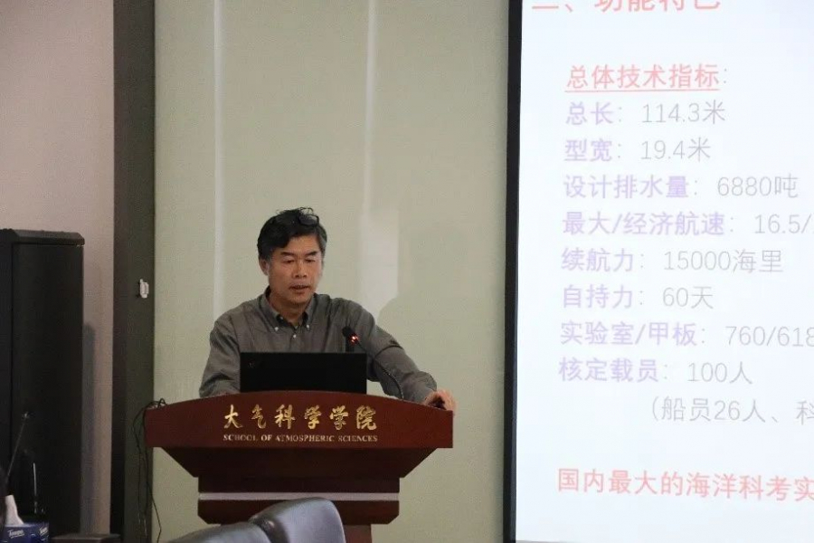 于卫东副院长从建造历程、功能特色、功能定位、科考实践四个方面介绍“中山大学”号海洋综合科考实习船。于院长表示,“中山大学”号的功能定位与交大海洋学院的学科方向非常契合,具有广阔的合作空间,希望依托科考船加强人才培养、科学研究方面的合作。