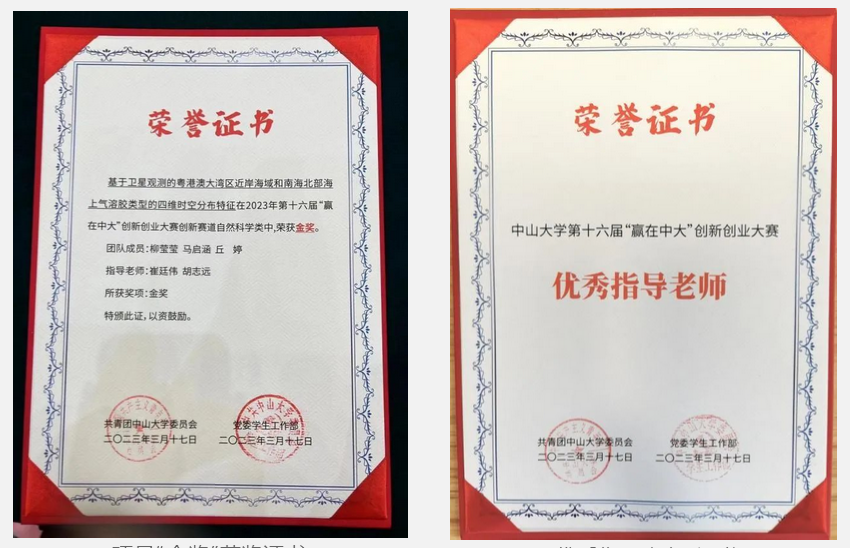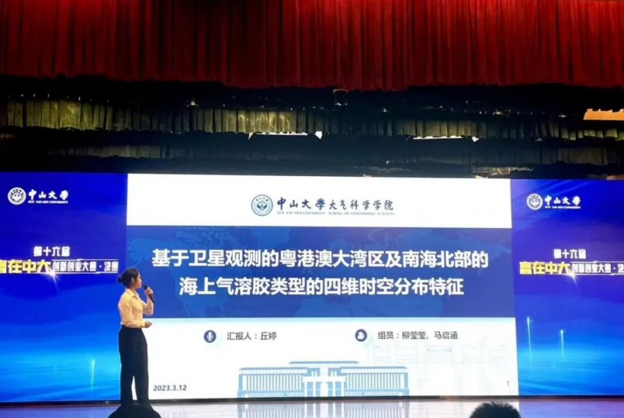 3月17日下午,中山大学第十六届“赢在中大”创新创业大赛颁奖典礼暨第十七届“挑战杯”广东大学生课外学术科技作品竞赛动员大会在广州校区南校园举行。我院2019级本科生柳莹莹(项目负责人)、马启涵、丘婷的研究项目——《基于卫星观测的粤港澳大湾区近岸海域和南海北部海上气溶胶类型的四维时空分布特征》在创新赛道自然科学类中荣获金奖。作品指导老师为崔廷伟教授、胡志远副研究员,获优秀指导老师称号,学院获优秀组织奖。