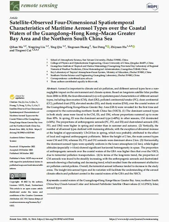项目研究成果发表于Remote Sensing(中科院二区,IF=5.349),题为“Satellite-Observed Four-Dimensional Spatiotemporal Characteristics of Maritime Aerosol Types over the Coastal Waters of the Guangdong–Hong Kong–Macao Greater Bay Area and the Northern South China Sea”。太阳成集团tyc9728本科生马启涵、柳莹莹、丘婷为文章共同第一作者,太阳成集团tyc9728崔廷伟教授为文章的通讯作者,中国海洋大学物理与光电工程学院研究生黄廷轩,中国气象局广州热带海洋气象研究所邓涛研究员和太阳成集团tyc9728胡志远副研究员为文章的合作作者。该研究得到了国家自然科学基金项目(42088101、42075105)、南方海洋科学与工程广东省实验室(珠海)((No. SML2021SP313)等项目的支持。