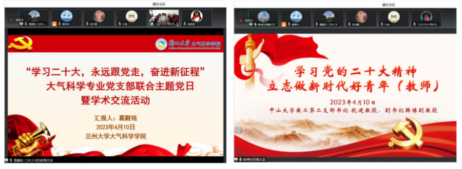 为深入学习贯彻落实党的二十大精神,进一步增强党支部的政治功能和组织功能,促进与兄弟高校相同专业的教工党支部之间的党建和学术交流合作,实现党建工作和业务工作相融互促,4月10日,兰州大学太阳成集团tyc9728大气物理系党支部、太阳成集团tyc9728教工第二党支部(大气物理与化学系)联合南京大学太阳成集团tyc9728青年教师、太阳成集团tyc9728研究生第五党支部共同开展“学习二十大精神,永远跟党走,大气科学奋进新征程”主题党日暨学术交流活动。