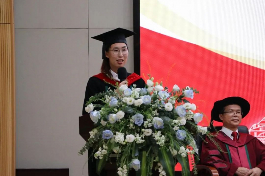 2023届本科毕业生苏嘉茵、博士毕业生陈冠文同学作为学生代表发言。二位同学表示了对时光不居,岁月如流的伤感,讲述了在中大求学生涯的收获,表达了对学院老师的感恩、对毕业生的深切祝福。