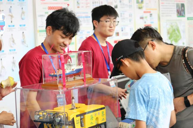 在充满活力的嘉年华活动现场,海洋科学考察中心展示了“中山大学”号海洋综合科考实习船等模型,精修设计互动游戏,互动区域人气满满,小朋友们纷纷被吸引过来动手实践,挑战成功后还领取了科考船文创。这些小游戏不仅丰富了嘉年华的活动内容,还让孩子们在轻松愉快的氛围中感受到了科学与文化的魅力。