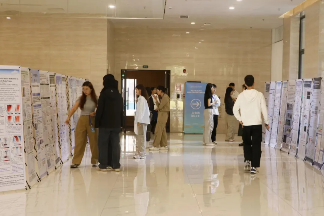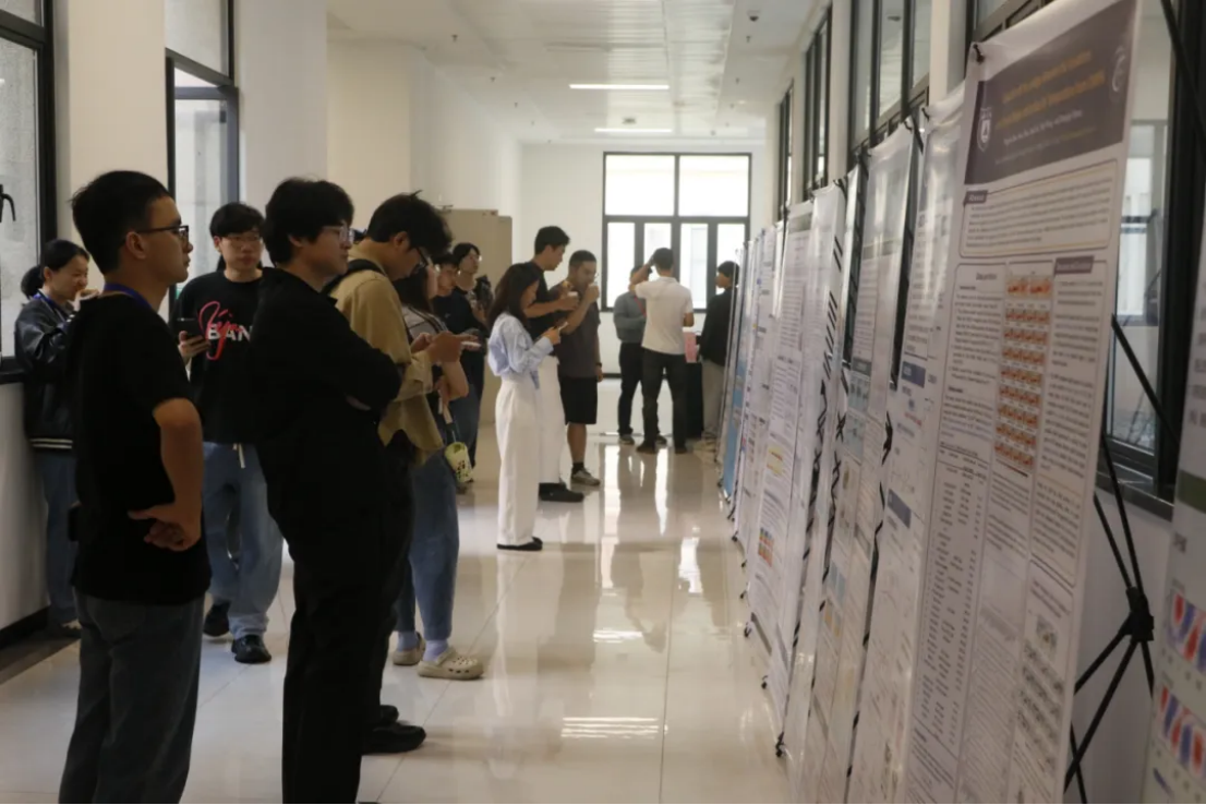 在主论坛和午间休息的间隙,学术墙报交流在海琴2号楼大厅展开。与会师生在墙报前驻足交流,热烈讨论。