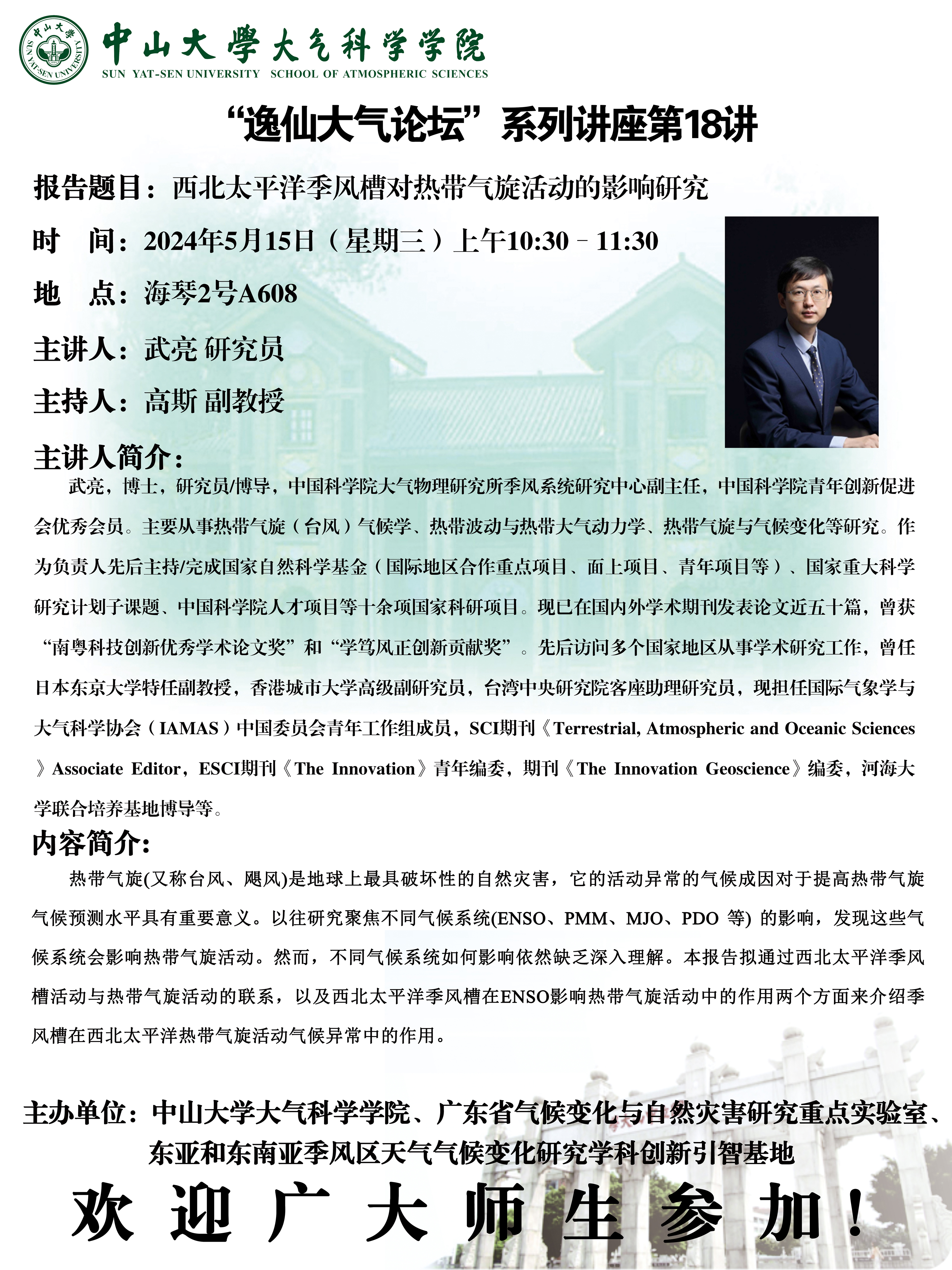 【学术预告】(2024年“逸仙大气论坛”系列讲座第18讲)西北太平洋季风槽对热带气旋活动的影响研究