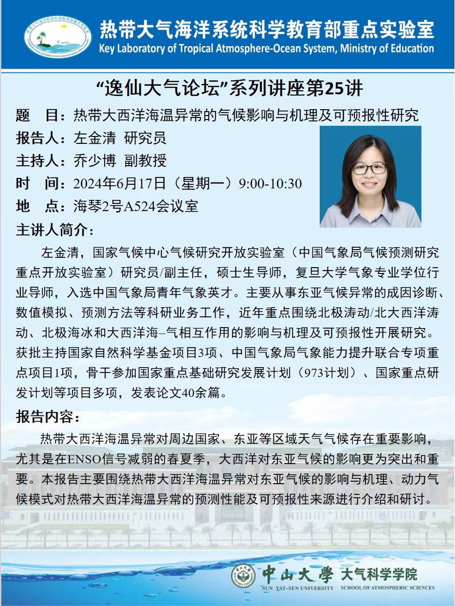 【学术预告】(2024年“逸仙大气论坛”系列讲座第25讲)热带大西洋海温异常的气候影响与机理及可预报性研究