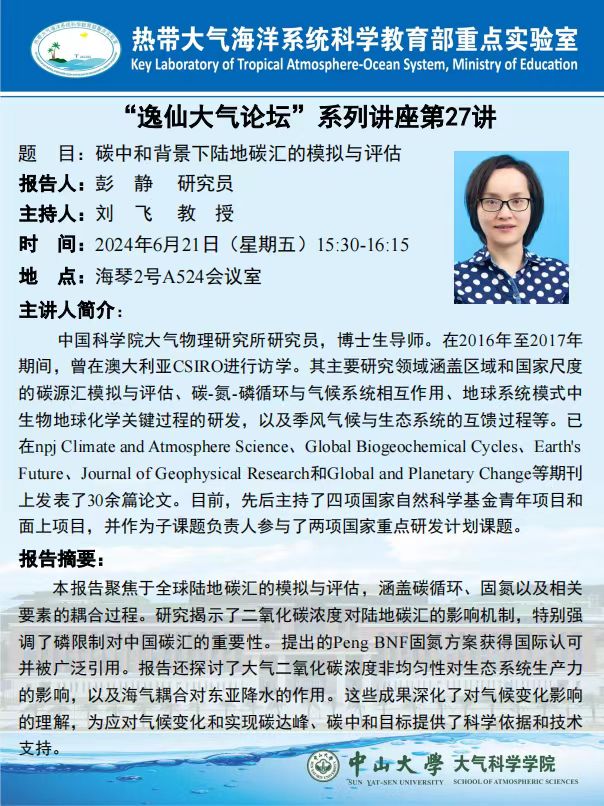【学术预告】(2024年“逸仙大气论坛”系列讲座第27讲)碳中和背景下陆地碳汇的模拟与评估