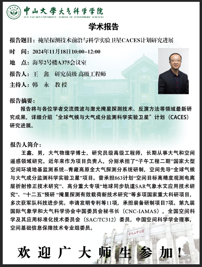 【学术预告】(2024年“逸仙大气论坛”系列讲座第54讲)掩星探测技术前沿与科学实验卫星CACES计划研究进展