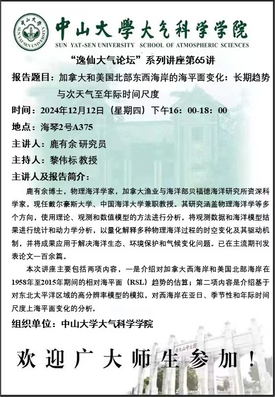 【学术预告】(2024年“逸仙大气论坛”系列讲座第65讲)加拿大和美国北部东西海岸的海平面变化:长期趋势 与次天气至年际时间尺度