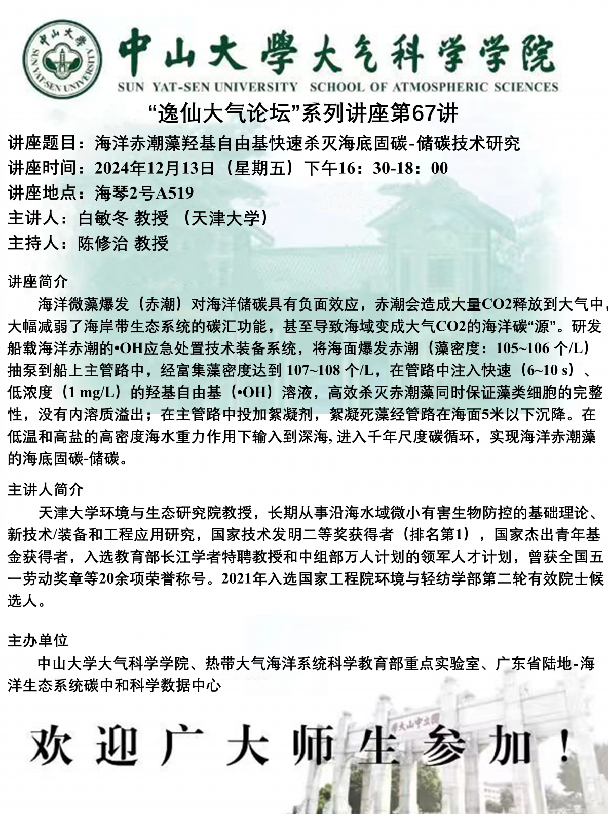 【学术预告】(2024年“逸仙大气论坛”系列讲座第67讲)海洋赤潮藻羟基自由基快速杀灭海底固碳-储碳技术研究