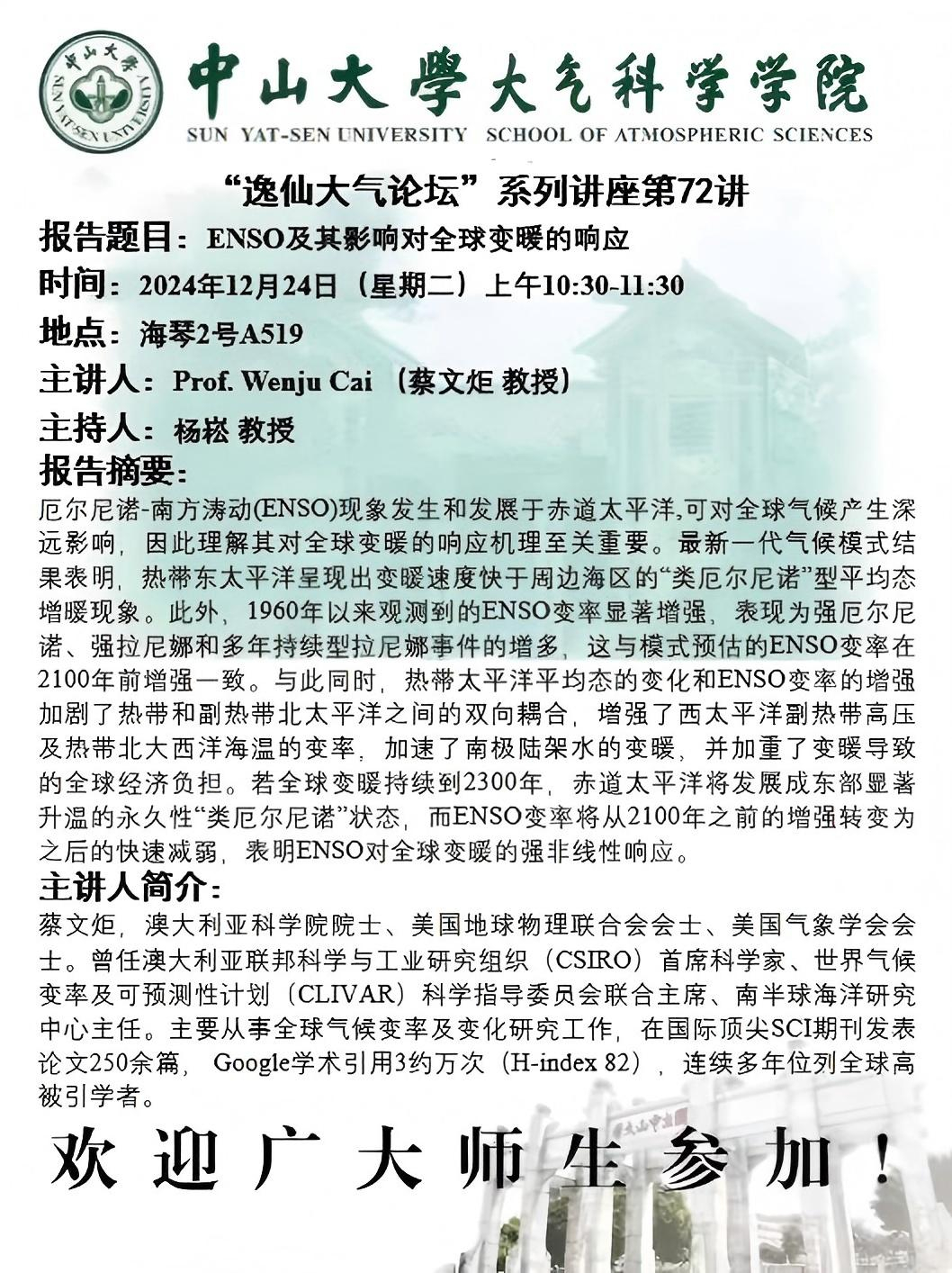 【学术预告】(2024年“逸仙大气论坛”系列讲座第72讲)ENSO及其影响对全球变暖的响应