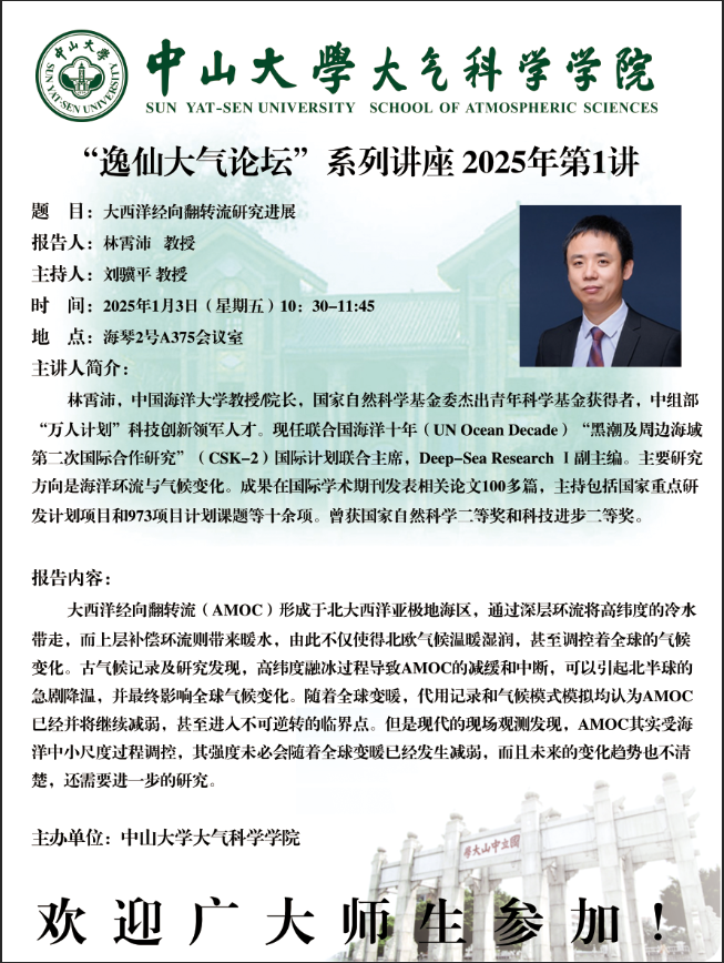 【学术预告】(2025年“逸仙大气论坛”系列讲座第1讲)大西洋经向翻转流研究进展
