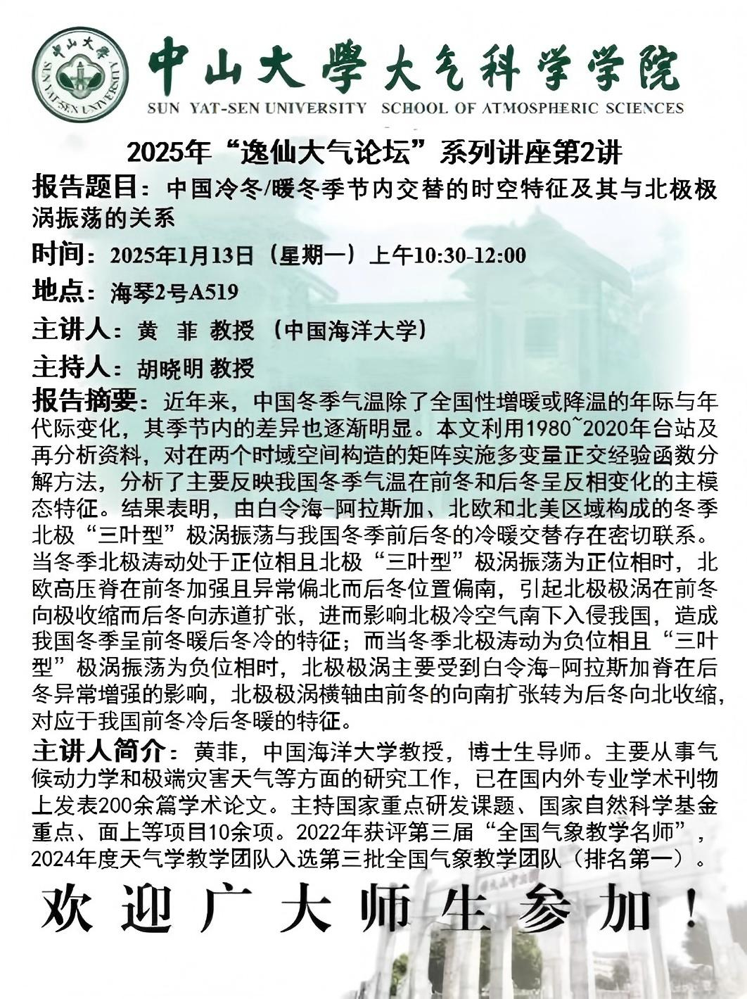 【学术预告】(2025年“逸仙大气论坛”系列讲座第2讲)中国冷冬/暖冬季节内交替的时空特征及其与北极极涡振荡的关系