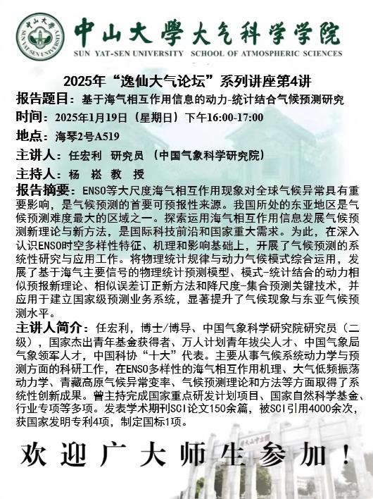 【学术预告】(2025年“逸仙大气论坛”系列讲座第4讲)基于海气相互作用信息的动力-统计结合气候预测研究