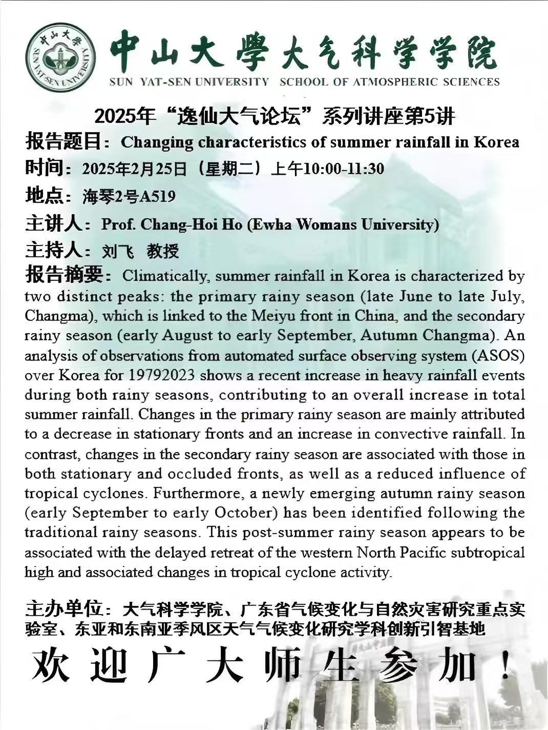 【学术预告】(2025年“逸仙大气论坛”系列讲座第5讲)Changing characteristics of summer rainfall in Korea