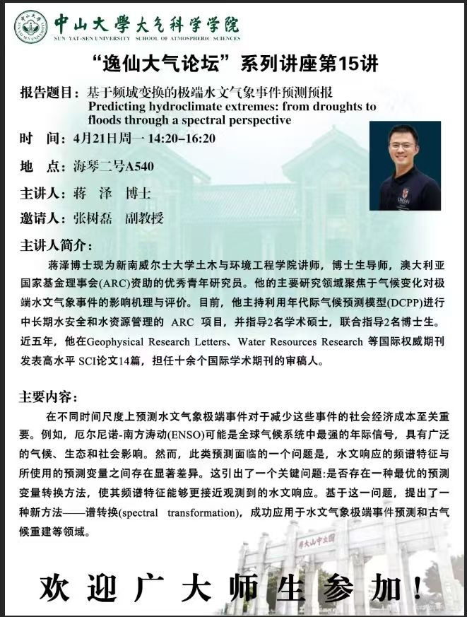 【学术预告】(2025年“逸仙大气论坛”系列讲座第15讲)基于频域变换的极端水文气象事件预测预报