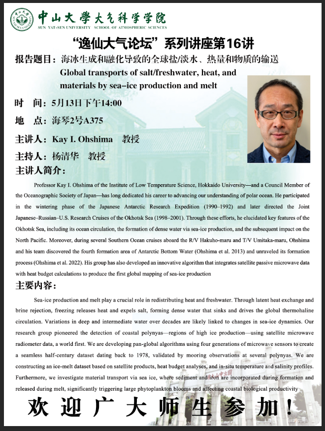 【学术预告】(2025年“逸仙大气论坛”系列讲座第16讲)海冰生成和融化导致的全球盐/淡水、热量和物质的输送