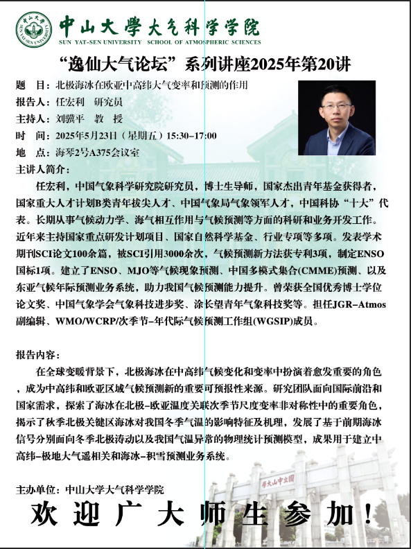 【学术预告】(2025年“逸仙大气论坛”系列讲座第20讲)北极海冰在欧亚中高纬大气变率和预测的作用