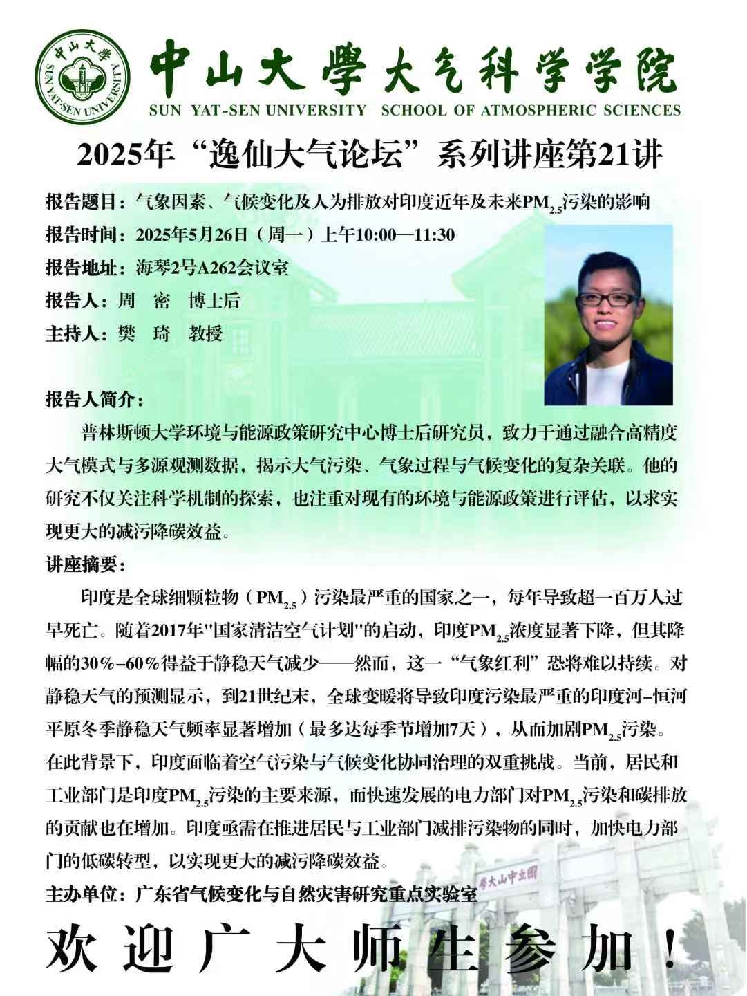 【学术预告】(2025年“逸仙大气论坛”系列讲座第21讲)气象因素、气候变化及人为排放对印度近年及未来PM2.5污染的影响