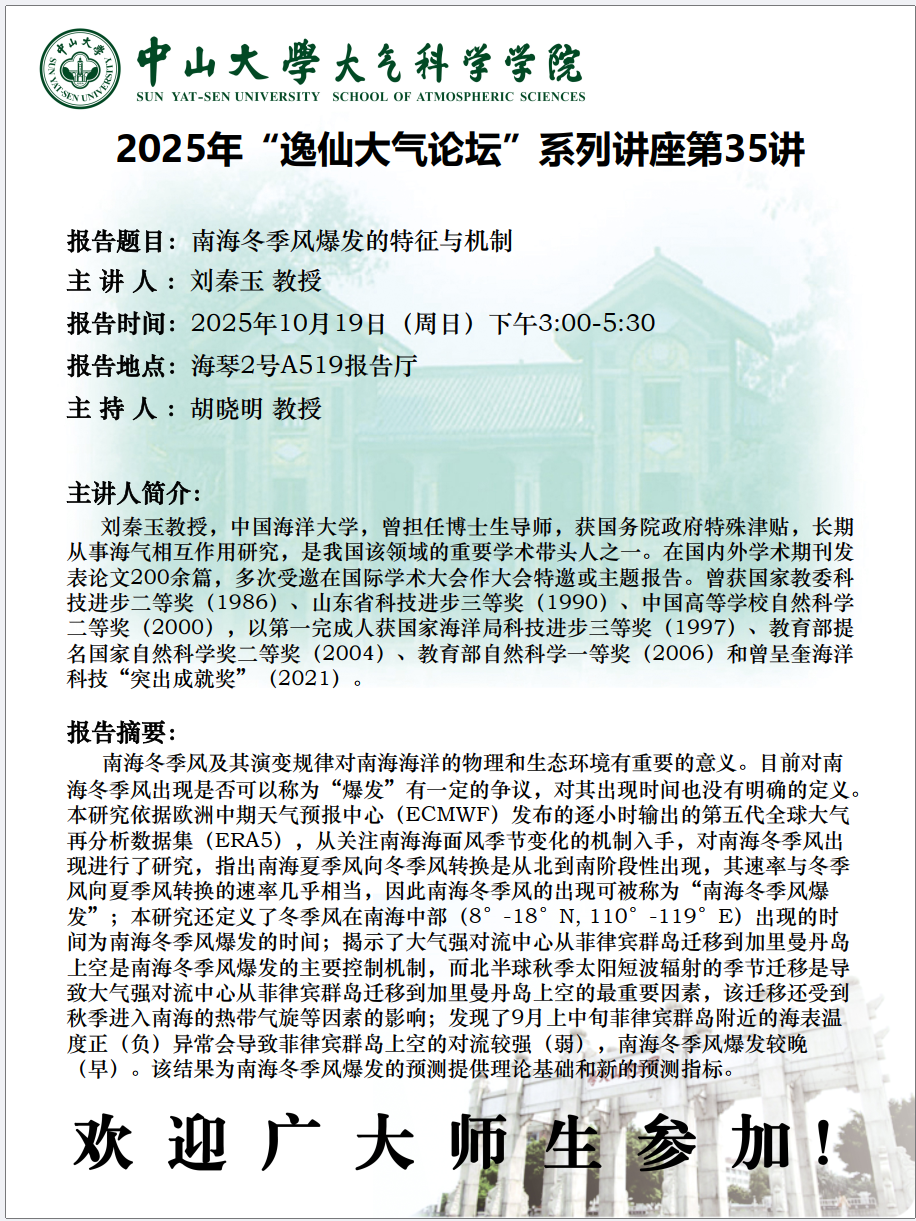【学术预告】(2025年“逸仙大气论坛”系列讲座第35讲)南海冬季风爆发的特征与机制