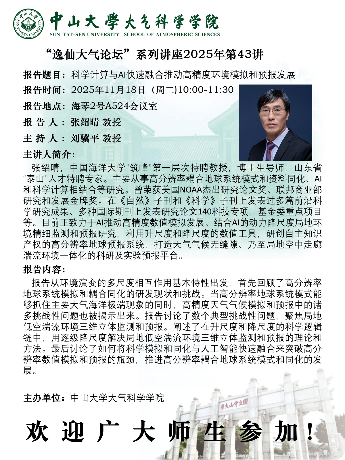 【学术预告】(2025年“逸仙大气论坛”系列讲座第43讲)科学计算与AI快速融合推动高精度环境模拟和预报发展