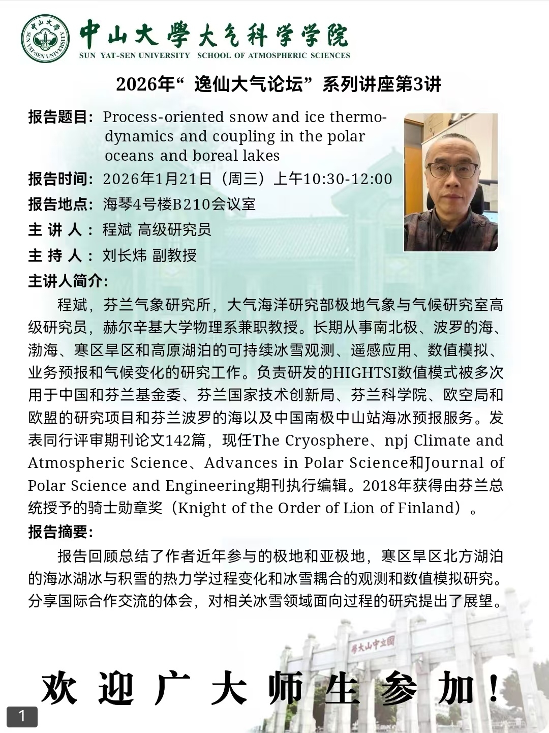 【学术预告】(2026年“逸仙大气论坛”系列讲座第3讲)Process-oriented snow and ice thermo-dynamics and coupling in the polar oceans and boreal lakes
