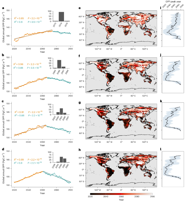 研究结果显示,在四个情景中,未来的全球GPP总量将在2074(SSP 1-2.6), 2066(SSP 2-4.5), 2065(SSP 3-7.0), 2060(SSP 5-8.5)达到峰值;峰值较 2020 年平均上升约 5.4 % ± 0.5 %。空间分布上,高纬度植被的GPP普遍呈现持续上升态势;而热带两大主要的植被类型,常绿阔叶林与稀树草原的 GPP 已于 2030 年前见顶。二者合计贡献全球一半以上的 GPP,其持续下滑抵消了中高纬度的增量,导致本世纪中叶后全球总量显著回落。根本原因在于 VPD 升高对光合速率的抑制超过二氧化碳施肥的增益;在大多数植被类型中,随着大气二氧化碳浓度与 VPD 同步上升,光合速率、叶面积指数及 GPP 将同步下降。这一发现揭示,大气干旱加剧已成为驱动全球 GPP 的关键因素,对植被动态预测、地球系统模型改进以及气候减缓与碳排放政策制定具有深远意义。