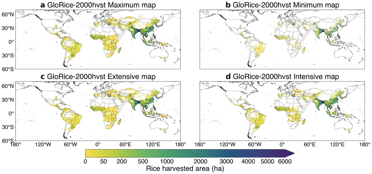 GloRice (I) 聚焦全球水稻收获与种植面积,构建了覆盖1961至2021年、分辨率达5弧分(约10公里)的长时序栅格数据集。研究融合国际权威空间数据(M3、SPAM等)与多层级统计资料(含国家级及中国、印度次国家级),显著提升了空间分布的精确性。数据集特别设计最大/最小(Maximum/Minimum)与扩展/集约(Extensive/Intensive)四类应用场景,可灵活适配粮食安全评估、温室气体汇算、土地利用分析等不同研究的模型或计算输入需求,譬如: