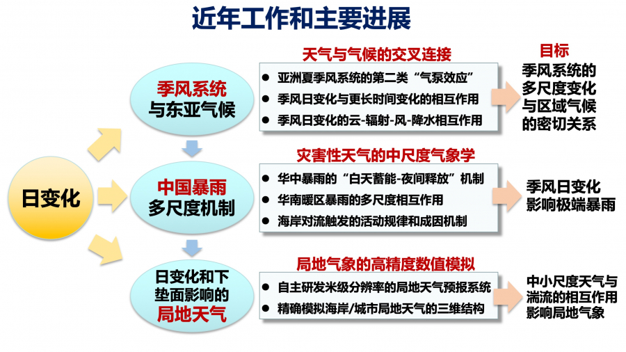 目前工作聚焦于:(1)探究天气与气候交叉连接,关注大尺度环流-区域日变化-中小尺度对流之间的相互作用,从日变化视角阐明气候变化和极端天气的成因机制,提出夏季风气流日变化、中国早晨暴雨等方面的理论模型;(2)研发米级分辨率的局地天气预报系统,面向海岸城市开展超高精度数值模拟和观测验证,进一步研究受日变化和复杂下垫面调控的中小尺度天气与湍流相互作用的机理,揭示水平对流卷、海风锋、强风/强上升流等局地气象的精细结构、演变机制和致灾机理。