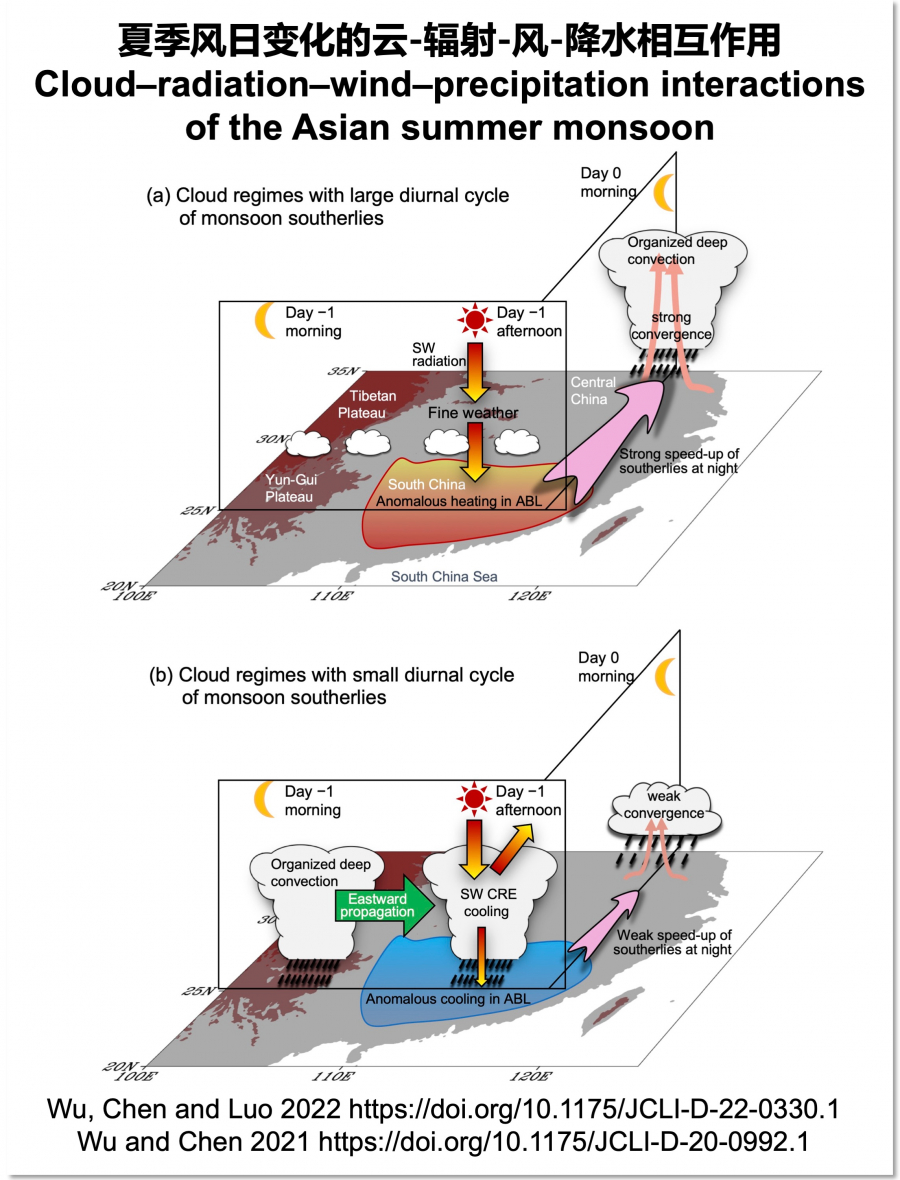 (1)阐明东亚夏季风气流夜间加速现象,较好解释了中国降水早晨峰值的成因 (Chen et al. 2009b JGR)。揭示活跃的季风气流伴随着风场日变化振幅的增强,对水汽输送辐合和降水日变化起关键贡献,成为影响东亚气候的重要驱动力 (Chen et al. 2013 JGR)。参加JRA-55评价计划,综合评估全球再分析资料表征季风区日变化的能力,为改善气候模式和再分析资料应用提供重要信息 (Chen et al. 2014b JCLI),入选再分析资料库的关键参考论文。(2)揭示夜间加强的季风气流能起到大尺度的气泵作用,能把大量水汽从热带输送到副热带地区,加强喜马拉雅山脚和中国东部平原的凌晨降水,增强夏季风经向环流的北部上升支。这种过程的物理机制、峰值时间和影响区域区别于早前所知的午后峰值上坡风和热对流(感热气泵),可被称为第二类“气泵效应” (Chen 2020 JCLI)。白天和夜间气泵共同构成季节气泵,驱动亚洲夏季风系统。研究还发现,季风气流日变化与东亚夏季降水的季节内变化、年际和年代际变化存在密切关系,当活跃季风气流耦合较强(较弱)风场日变化时,我国夏季雨带位置异常偏北(偏南),显示了短时间尺度天气与长时间尺度气候之间的交叉链接(Chen et al. 2021 JCLILiu et al. 2022 JCLILiu et al. 2024 JCLI)。人类影响的辐射效应可影响区域热力差异,调节风场和降水日变化的长期趋势(Lin and Chen 2023 JCLI)。(3)为解释风和降水日变化的成因,向前溯源探究与夏季风日变化有关的云辐射强迫,揭示了云-辐射-风-降水相互作用的完整链条。结果发现,华南天气状态的云辐射强迫可显著调节季风气流日变化。 华南季风气流日变化受云贵高压天气状态的东传影响,进而调节下游华中天气变化。 华南上空的天气状态及其与上下游区域天气变化的超前滞后关系,表明季风气流日变化具有可预报性 (Wu, Chen and Luo 2023 JCLI)。