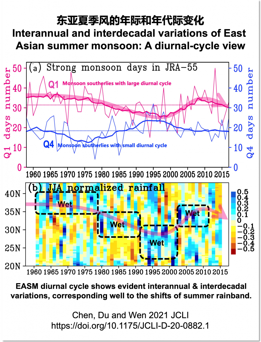 • Chen, G.*, Y. Du, and Z. Wen, 2021: Seasonal, interannual, and interdecadal variations of the East Asian summer monsoon: A diurnal-cycle perspective. J. Climate34 (11), 4403–4421. https://doi.org/10.1175/JCLI-D-20-0882.1  [PDF]「夏季风气流日变化与东亚降水的年际/年代际变化」